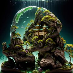 miniature,bonsai,independent building,grass,nature,no humans,(underwater:1.3),goldfish,golden,circular ring,fluorescent light,flsorescence,glowing,(((a Mountain made of natural jades and Gems))),(waters),Ancient pavilion,plants,black background,(auspicious clouds:1.1),<lora:ShanShuiHua_v18:0.85>,