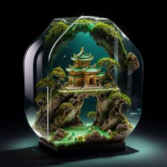photorealistic,realive,miniature,bonsai in glass box,independent building,grass,nature,no humans,(underwater:1.3),fantasy,goldfish,golden,gold trim,circular ring,fluorescent light,flsorescence,glow,glowing,jade and gem textured,(((mountain made of natural jades and Gems))),(waters),Ancient pavilion,plants,jewelry of jadeite and jade,genuine pearl,(auspicious clouds:1.1),towering trees,<lora:iconsGoBk_v16:0.4>,