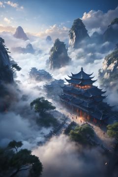 Ancient China, Wuxia World, Black Through the Cave, surrounded by mist, vast panorama, Unreal light and shadow, wide Angle lens, captured at dusk, cinematic texture, Unreal Engine 4, 8K Ultra HD, clear and bright image quality, amazing fantasy immortal scenes, ink painting style, highly refined, dynamic expression, clear lines, cinematic texture, cool atmosphere, Vivid, high octane rendering, extremely fine,wujie,wanjianguizong,xiamap