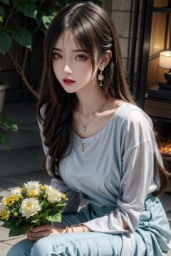 masterpiece, Original, Stand, a beautiful woman with a bouquet of flowers in her hand, long hair, wearing a suit on the upper body, light gray thick tights on the lower body, Bag, jewelry, Necklace, Earrings, Ring, rounded at the knees, waiting for someone, with a sweet smile, newspaper, The best quality, Ray tracing, 8k