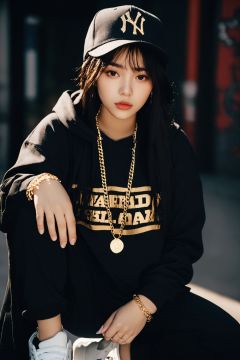 photographic of a girl, 20 years old, clear facial contour, upper body, looking at viewer,hip-hop style, baggy pants, oversized hoodies, gold chains, snapback hats, high-top sneakers, bold prints. Beautiful dynamic dramatic dark moody lighting, volumetric, shadows,  BREAK, 35mm photograph, grainy, professional, 8k, highly detailed, Hasselbald 50mm lens f/1.9,[by ethan for CGArt Mayfly model]