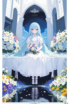 ((best quality)), ((masterpiece)), ((ultra-detailed)), (illustration), (detailed light), (an extremely delicate and beautiful),((trim)),incredibly_absurdres,(ray tracing),(reflection light),((Movie Poster)),(signature:1.3),(English text:1.3),BREAK,(8k:1.3), Wallpaper, 1girl, (girl middle of flower:1.4), (pure skyblue hair, red eyes:1.5), clear sky, outside, ultra-detailed, best quality, extreme quality, Masterpiece, beautiful, pretty, sitting on the ground, (absurdly long hair, clear boundaries of the cloth:1.4), (pure white dress, pure white silk cloth:1.5), (ground of flowers, thousand of flowers, colorful flowers, flowers around her, various flowers:1.51), young, stunning, attractive, sundress, fantastic scenery, pure white shoes