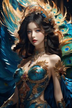 Best Quality, masterpiece, ultra-high resolution, (photo realistic: 1.4) , Surrealism, Fantastical verisimilitude, beautiful blue-skinned goddess Phoenix Peacock on her head, fantastical creation, thriller color scheme, surrealism, abstract, psychedelic, 1 girl,