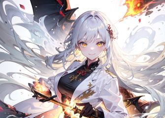 1girl, fire, (((dragon))), smile, flower, coat, weapon, sword, outdoors, beach, holding, flame, solo, bangs, yellow eyes, long hair, hair flower, hair ornament, white hair, looking at viewer, open clothes, long sleeves, white coat, open coat  <lora:beautifulDetailedEyes_v10:0.4> <lora:chilloutmixlong_v10:0.4> <lora:epiNoiseoffset_v2:0.4>