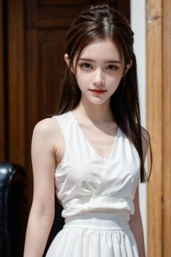 (Good anatomical structure), HDR, UHD, 8K, A real person, Highly detailed, best quality, masterpiece, 1girl, realistic, Highly detailed, (EOS R8, 50mm, F1.2, 8K, RAW photo:1.2), ultra realistic 8k, emma, 1girl, solo, brown hair, ,kind smile, pose for picture, looking_at_viewer,white dress
