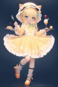 (cinematic lighting), dreamy atmosphere, Ray tracing, (((solo))), (loli:1.5), (child:1.5), (petite:1.5), green eyes, (animal ears), dress, solo, food, blonde hair, open mouth, long hair, pancake, flower, holding, bow, smile, fork, bird, socks, looking at viewer, shoes, striped background, holding fork, bonnet, striped, frills, long sleeves, :d, yellow dress, bangs, eyebrows visible through hair, blush, green nails, hair bow, nail polish, diagonal stripes, chick, sparkle, frilled dress, orange bow, fruit, full body, :3, hair between eyes, green bow, puffy sleeves, heart, lemon, orange footwear, animal ear fluff, white bow, cat ears, bobby socks, orange headwear, see-through sleeves, blue background, striped bow, hair ornament, white legwear, mary janes