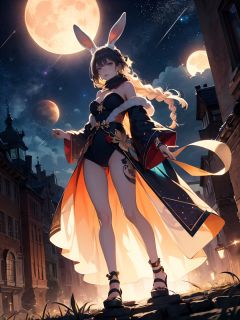 masterpiece,(ultra detailed:1.3),best quality,Mid-Autumn Festival, moon background,1girl,(full body:1.7), (Slim body:1.1),(long legs:1.3),solo focus,1girl,solo,jewelry,very long hair,hair ornament,earrings,black hair,facial mark,wind,mole under eye,bracelet,beads,scarf ,tattoo,braid,braids,floating hair,black eyes,,colorful,cinematic lighting,(sparkle:1.2),(photorealistic:1.4),(cinematic_angle:1.3),unity 8k wallpaper,(the huge moon behind the body:1.3),(starry sky:1.3),lotus pedestal,(lens flare:1.1),(white fluffy giant rabbit:1.3),(starish:1.3),(starrynebula:1.2),looking at viewer,the corridor of the palace,(off shoulder:1.2),(festiveMidAutumnsetting:1.2),looking at viewer,(ultra detailed:1.3),(sophisticatedarchitecture),(illumination effect with a dreamy feeling:1.2),(texturedfabrics),(detached sleeves:1.1),