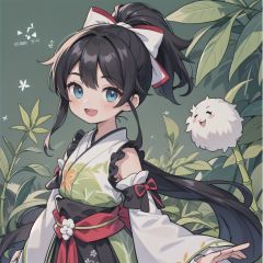 1girl, :d, artist_name, bamboo, black_hair, blue_eyes, bow, detached_sleeves, green_background, japanese_clothes, leaf, long_hair, looking_at_viewer, open_mouth, pom_pom_\(clothes\), ponytail, smile, solo, twitter_username, very_long_hair, wide_sleeves