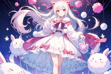 1girl, bangs, blush, bow, closed_mouth, dress, full_body, fur-trimmed_skirt, fur_trim, hair_bow, holding, long_hair, looking_at_viewer,pink_bow, pom_pom_\(clothes\), red_eyes,  smile, solo, standing, striped, striped_bow, very_long_hair, white_dress, white_hair, pom pom \(clothes\), cotton ball, bow, decorative balls, stuffing, stuffed bunny,nsfw