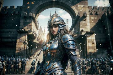 best quality,masterpiece,colorful,dynamic angle,highest detailed,<lora:ArmoredWarrior-000015:0.8>,Armor,1 girl,(blue eye:1.3),(blue armor:1.3),the black iron gate of the city wall,watching the audience,war-ridden,backlighting,