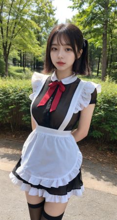 best quality,8k,ultra high res,soft light,cowboy_shot,front view,1girl,solo,black hair,twintails,short hair,curvy,huge breasts,maid,maid apron,bow,white apron,red ribbon,puffy sleeves,black dress,frilled dress,frilled apron,black_thighhighs,looking at viewer,arms at sides,closed mouth,(see-through:1.2),outdoors,(The background is in the primitive forest:1.2),<lora:maiduniform_styleA1:0.8>,