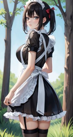 best quality,8k,ultra high res,soft light,cowboy_shot,from behind,from_back,1girl,solo,black hair,twintails,short hair,huge breasts,maid,maid apron,bow,white apron,red ribbon,puffy sleeves,black dress,frilled dress,ass,frilled apron,black_thighhighs,looking at viewer,arms at sides,closed mouth,(see-through:1.2),outdoors,(The background is in the primitive forest:1.2),<lora:maiduniform_styleA1:0.8>,