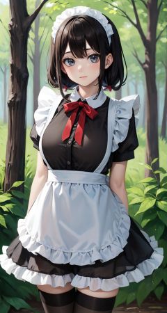 best quality,8k,ultra high res,soft light,cowboy_shot,standing,1girl,solo,black hair,twintails,short hair,huge breasts,maid,maid apron,bow,white apron,red ribbon,puffy sleeves,black dress,frilled dress,frilled apron,black_thighhighs,looking at viewer,arms at sides,closed mouth,(see-through:1.2),outdoors,(The background is in the primitive forest:1.2),<lora:maiduniform_styleA1:0.8>,