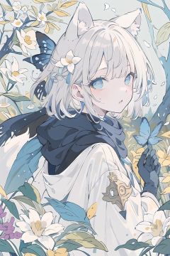 (masterpiece:1.2), high_quality ,occultism, Aestheticism Painting , (flat color), best quality, soft lighting, (depth_of_field:1.3),(solo:1.4), [close-up], (1girl), detailed beautiful blue eyes, (silvery hair) , wolf_ears, short_hair,archbishop_robe ,largr_sleeve, grey_cloak, blooming, looking_at_viewer, lily (flower) , blue butterfly, (fantastic colorful),fluorescence, (forest:1.25), tree_shade, (flowers meadows:1.4), flower, leaves, looking back, cute_fang, black gloves, long scarf,