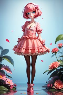 <lora:tifa_20230927100217:0.9>,LU,1girl,pink hair,blue eyes,flower,solo,dress,short hair,necklace,jewelry,rose,standing,pantyhose,full body,bird,feathers,