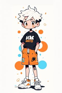 A boy with short white hair, black T-shirt, orange shorts, white sneakers, hands in pockets, white background, graffiti on the background,,simple details,<lora:doodlev2_test:0.8>,<lora:3D cartoon avatar_v1:0.5>,, masterpiece,high quality,