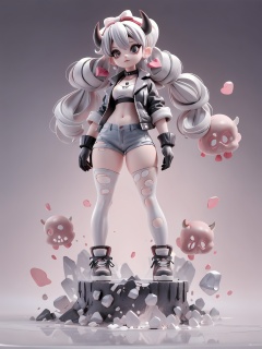 1girl,black eyes,black hair,black legwear,boots,bow,choker,earrings,full body,hair bow,heart,horns,jacket,jewelry,looking at viewer,medium hair,pants,pantyhose,shirt,shoes,skull,sneakers,spikes,standing,torn clothes,torn gloves,torn jacket,torn jeans,torn legwear,torn pants,torn shirt,torn shorts,torn skirt,torn sleeves,twintails,silvercarvingcd,(((silver brilliance body)))