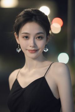 looking at viewer,a woman,night,BLACK EYES,sexy lips,reality,realistic,skin texture,surreal dramatic lighting shadow,<lora:neg4all_bdsqlsz_xl_V7>,<lora:DetailedEyes_xl_V2>,smile,photo_(medium),depth of field,sony a1 shooting,gm85mm1.4,eye-contact,solo_focus,canonicals,cocktail_dress,collarbonea,heart_earrings,alternate_headwear,Agnes Cecile,
