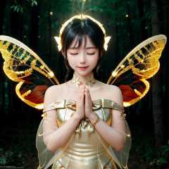 (Masterpiece, best quality, complex details),unreal engine, portrait,1girl, tiny cute and adorable, smile, bow the head, closed eyes, praying, wearing butterfly suit, bare shoulders, chitin, 2 wings, (translucent, golden butterfly_wings), powdered gold,(lighting forest), colorful, rimming light, lighting effect,<lora:ButterflyX:0.7><lora:koreanDollLikeness_v15:0.3> <lora:fanSiSi_v11:0.3> <lora:Ningning_v10:0.3>