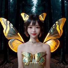 (Masterpiece, best quality, complex details),unreal engine, portrait,1girl, tiny cute and adorable, smile, wearing butterfly suit, bare shoulders, chitin, 2 wings, (translucent, golden butterfly_wings), powdered gold,(forest:1.6), colorful, rimming light, lighting effect,<lora:ButterflyX:0.7><lora:koreanDollLikeness_v15:0.3> <lora:fanSiSi_v11:0.3> <lora:Ningning_v10:0.3>