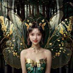 (Masterpiece, best quality, complex details),unreal engine, portrait,1girl, tiny cute and adorable, smile, wearing the beautiful butterfly, bare shoulders, chitin, 2 wings, (translucent, golden butterfly_wings), powdered gold,(forest:1.6), colorful, rimming light, lighting effect,<lora:ButterflyX:0.6><lora:oliviaDiffusion_v2:0.3><lora:koreanDollLikeness_v15:0.3> <lora:fanSiSi_v11:0.5>  <lora:hipoly3DModelLora_v10:0.4>