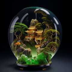 photorealistic,realive,miniature,bonsai in glass box,independent building,grass,nature,no humans,(underwater:1.3),fantasy,goldfish,golden,gold trim,circular ring,fluorescent light,flsorescence,glow,glowing,jade and gem textured,(((mountain made of natural jades and Gems))),(waters),Ancient pavilion,plants,jewelry of jadeite and jade,genuine pearl,(auspicious clouds:1.1),towering trees,light strip,transparent acrylic,<lora:ali_golden_v22:0.8>,