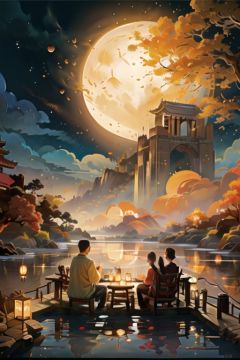 masterpiece,high quality,highres,detailed,masterpiece,wallpaper,Mid-Autumn Festival,qiuyinong,moon, cloud, sky, scenery, water, multiple boys, tree, sitting, full moon, night, river, reflection, outdoors, fireflies, japanese clothes, bridge, family,<lora:qiuyinong-000010:0.8>,