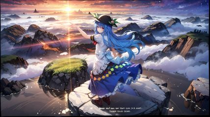 (1girl, solo, ray tracing), (spring), (signature), (English text:1.5), (fog), (pine), ((border)), (trim), ((from behind, from above, depth of field, far shot)), (full body), ((facing away, 1 girl standing on the top of the moutain, looking up, sea of clouds, rocks floating in the air)), ((open arms, )), floating hair, wind, (long hair, blue hair), ((rainbow, sunlight, sunset)), starred sky, (birds, red sky, morning, wind), ((hinanawi tenshi)), (hat, peach, skirt, frills), hinanawi tenshi, <lora:EMS-13074-EMS:1.000000>