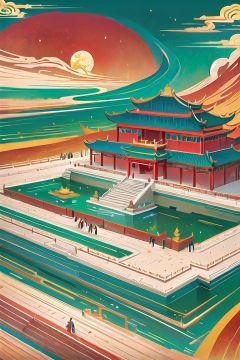 flat illustration,Chinese palace,gold, red,retrostrong contrast