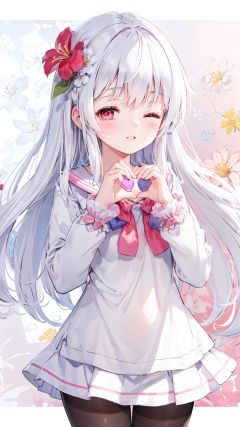 1girl, long hair, solo, red eyes, serafuku, hair_flower, white hair, long sleeves, pleated, clear eyes, black pantyhose, look at viewer, depth of field, (+floral background+), happy, parted lips, white clothes, (heart hands), between thighs, one eye closed,