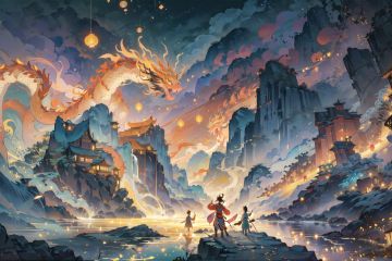 qiuyinong, eastern dragon, angry giant dragon,flood,thunder,ocean,storm,multiple people inthe mountain,  weapon, facing away, Chinese clothes,Hanfu, sword, paper lantern, sky, standing, child, black hair, outdoors, holding, myth,2D ConceptualDesign
