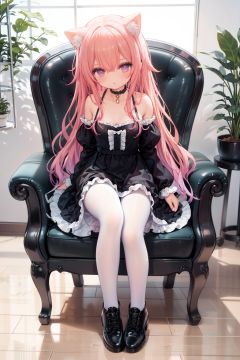 masterpiece, ((best quality)),  dynamic angle, chromatic aberration, ((colorful)),1girl, animal ears, dress, tail, solo, long hair, pantyhose, purple eyes, cat ears, cat, cat girl, cat tail, black dress, white pantyhose, standing, indoors, black footwear, animal ear fluff, looking at viewer, flower, off shoulder, full body, frilled dress, brown hair, long sleeves, blush, bangs, plant, choker, bare shoulders, potted plant, wooden floor, black choker, frills, boots, parted lips, very long hair, animal, blonde hair, chair, bow, collarbone, puffy sleeves, hair between eyes, shoes, black collar