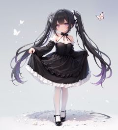 masterpiece, ((best quality)),  dynamic angle, chromatic aberration, ((colorful)),1girl, solo, black hair, long hair, dress, butterfly, bug, twintails, black footwear, lolita fashion, very long hair, pantyhose, black dress, long sleeves, bow, full body, bangs, flower, puffy sleeves, standing on one leg, shoes, white pantyhose, hair bow, looking at viewer, grey eyes, frills, standing, gothic lolita, blush, juliet sleeves, black bow, frilled dress, white flower, rose, closed mouth, skirt hold, petals, wide sleeves, mary janes, white rose