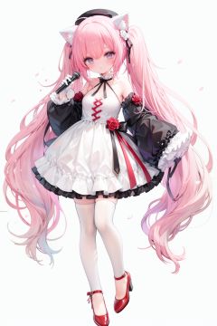 masterpiece, ((best quality)),  dynamic angle, chromatic aberration, ((colorful)),1girl, solo, flower, thighhighs, white thighhighs, gloves, red footwear, long hair, detached sleeves, animal ears, rose, blonde hair, looking at viewer, full body, hat, high heels, petals, dress, standing, twintails, wide sleeves, holding, shoes, frills, red flower, cat ears, bangs, microphone, long sleeves, white flower, hair ornament, white gloves, zettai ryouiki, bare shoulders, pink eyes, frilled dress, small breasts, breasts, closed mouth, skirt, beret, white headwear, very long hair, red eyes, red rose, white dress, blush, ribbon, black gloves, animal ear fluff, hair flower, pink flower