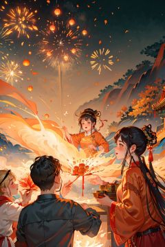 (((masterpiece))), ((extremely detailed CG unity 8k wallpaper)),(best illumination, best shadow, an extremely delicate and beautiful),(spring Festival), ((red traditional Chinese decorations)), red lanterns,1girl and her family, auspicious couplets,  firecrackers, family r,children playing, warm hugs, ((Chinese new year)),fire crackers,((beautiful fire works fills the sky)),warm light,many people,crowds,fire clouds