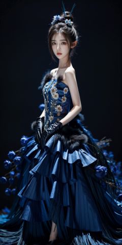 Peacock, 1 girl, solo, dress, gloves, feather dress, look at the audience, hair accessories, elbow gloves, Blue Eyes, cowboy shoot, standing, Hair Bun, bare shoulders, dress, hair bun, black gloves, flowers, Bangs, gray hair, shut up, black background, simple background,1 girl,yuzu,huolinger
