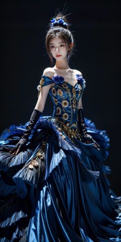 Peacock, 1 girl, solo, dress, gloves, feather dress, look at the audience, hair accessories, elbow gloves, Blue Eyes, cowboy shoot, standing, Hair Bun, bare shoulders, dress, hair bun, black gloves, flowers, Bangs, gray hair, shut up, black background, simple background,1 girl,yuzu,xinjiang,long_hair,looking_at_viewer, kind smile, pose for picture, floating hair,