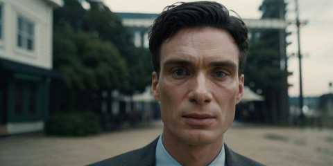 cinematic style,Cillian Murphy,solo,close-up,cibophobia,from below,dark tailored suit,parted lips,outdoors,blurry background,photorealistic,masterpiece,best quality,ultra highres,beautiful and detailed skin,realistic,dark,<lora:Oppenheimer-000000:1>,
