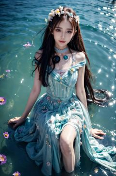 ((Good anatomical structure)),HDR, UHD, 8K, A real person , Highly detailed, best quality, masterpiece, 1girl, realistic, Highly detailed, (EOS R8, 50mm, F1.2, 8K, RAW photo:1.2), ultra realistic 8k cg, good anatomy,1 girl, solo focus,peafect body,Long hair,Messy hair,Bangs,hair between eyes,Sidelocks,Hair over shoulder,very long hair,shiny hair,floating hair,Bright eyes,big eyes,detailed eyes,beautiful eyes,hair ornament,hair flower,choker,frilled dress with lace,long dress,pleated dress,[loli],,outdoors,water,flower,sitting in the ((sea of flowers)), flower field,meadow,beautiful detailed sky,feather,nature,(sunlight),  skirt up,,moist skin, shiny skin, glossy skin, (best illumination, best shadow, extremely delicate and beautiful), perfect lighting, original, highres, dynamic angle, floating,depth of field, caustics,lens flare,warm lighting,(official art,beautiful and aesthetic:1.2),beautiful face, ultra detailed eyes, looking_at_viewer,kind smile,pose for picture,,glint sparkle,xulingxi,solo
