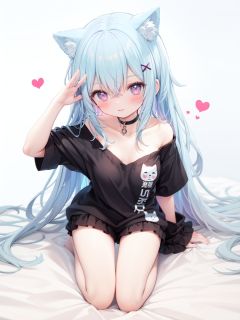 petite, loli, solo, animal ears, heart, puffy short sleeves, blue hair, long hair, off shoulder, bangs, hair ornament, gradient background,rainbow gradient, x hair ornament, animal ear fluff, looking at viewer, very long hair, blush, smile, cat ears, bare shoulders, collarbone, hand up, gradient sweater, hair between eyes, symbol-shaped pupils, arm up, heart-shaped pupils, hairclip, medium breasts, salute, bare legs,full body