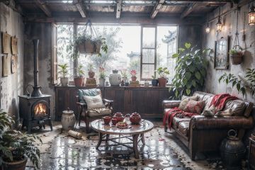 Best quality,masterpiece,dynamic angle,highest detailed,(clearness:1.3), Strong Contrast, High Color Contrastchinese watercolor paintingnight,Green plants, potted plants, eggplants, red chili peppers, indoors, windows, blankets, hanging baskets, teapots, stoves for lighting fires, wine cooler