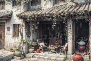 best quality,masterpiece,dynamic angle,highest detailed,(clearness:1.3)chinese watercolor paintingGreen plants, potted plants, eggplants, red chili peppers, under eaves, windows, fallen leaves, hanging baskets, teapots, stoves for lighting fires