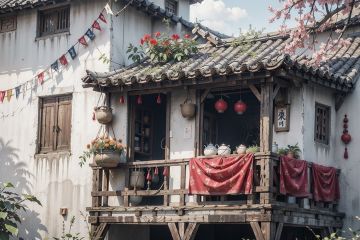 best quality, masterpiece, colorful, dynamic angle, highest detailedChineseWatercolorPainting, hanging basket, under the eaves, safflower, building, window, red pepper on the wall,Tea House,Flags fluttering