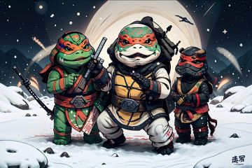 best quality,masterpiece,colorful,dynamic angle,highest detailed,<lora:Ninjaturtle-000010:1>,(3 ninja turtle:1.3),weapon,scarf,(white clothes:1.3),moon background,