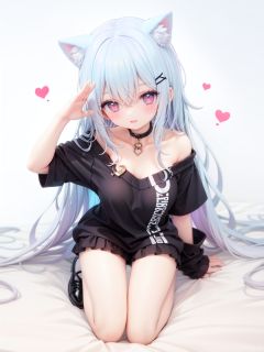 petite, loli, solo, animal ears, heart, puffy short sleeves, blue hair, long hair, off shoulder, bangs, hair ornament, gradient background,rainbow gradient, x hair ornament, animal ear fluff, looking at viewer, very long hair, blush, smile, cat ears, bare shoulders, collarbone, hand up, gradient sweater, hair between eyes, symbol-shaped pupils, arm up, heart-shaped pupils, hairclip, medium breasts, salute, bare legs,full body
