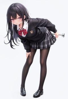 1girl, solo, pantyhose, skirt, long hair, loafers, shoes, simple background, school uniform, brown eyes, plaid, black pantyhose, plaid skirt, looking at viewer, black hair, pantyhose pull, full body, clothes pull, black footwear, pleated skirt, leaning forward, bangs, long sleeves, bent over, cardigan, bow, bowtie, standing, closed mouth, pulled by self, grey background, blush, miniskirt, red bow, sweater, **********