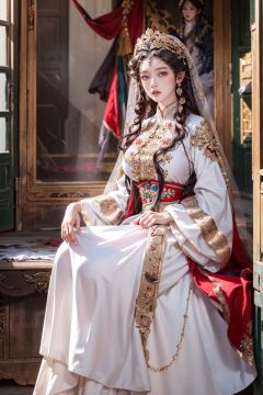 (Masterpiece, Best Quality), a girl in a white and red dress. Luxurious dress, detailed fabric texture, ray tracing, ultra wide angle, 4K, award-winning, Yuyao, huge breasts, long hair, luxury, nobility, beauty, ultra realistic, ultra clear picture quality, 8K, luxurious palace background, domineering queen, enchanting figure, dynamic posture, sitting, full of immortality, soft light. On the other side of the flower is a large box, official art, 8k unit wallpaper, super detailed, beautiful, masterpiece, best quality, very detailed, dynamic angle, realistic, realistic, detailed details, clear focus, movie lighting,