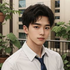masterpiece, 1 Man, Handsome, Look at me, White shirt, Tie, balcony, Potted plant, Portrait