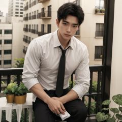 masterpiece, 1 Man, Handsome, Look at me, White shirt, Tie, balcony, Potted plant,