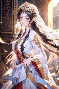 Luxury, noble, beautiful, super realistic, super clear picture quality, 8k, luxurious palace background, overbearing queen, enchanting figure, hand behind, background with holy light runes flashing, immortal aura diffuse, soft light... The other side flower has a big chest, official art, unit 8k wallpaper, super detailed, beautiful and beautiful, masterpiece, best quality, very detailed, dynamic Angle, paper skin, radius, brightness, a painting, a girl in a white and gold gauze dress standing elegantly. Her clothes reflect a luxurious texture, and her presence radiates power. (Masterpiece, best quality, more detail, vertical, realistic, realistic, one detail, sharp focus, movie lighting), ray tracing, Ultra Wide Angle, 4K, Award winning, Yuyao, huge breasts, long hair,